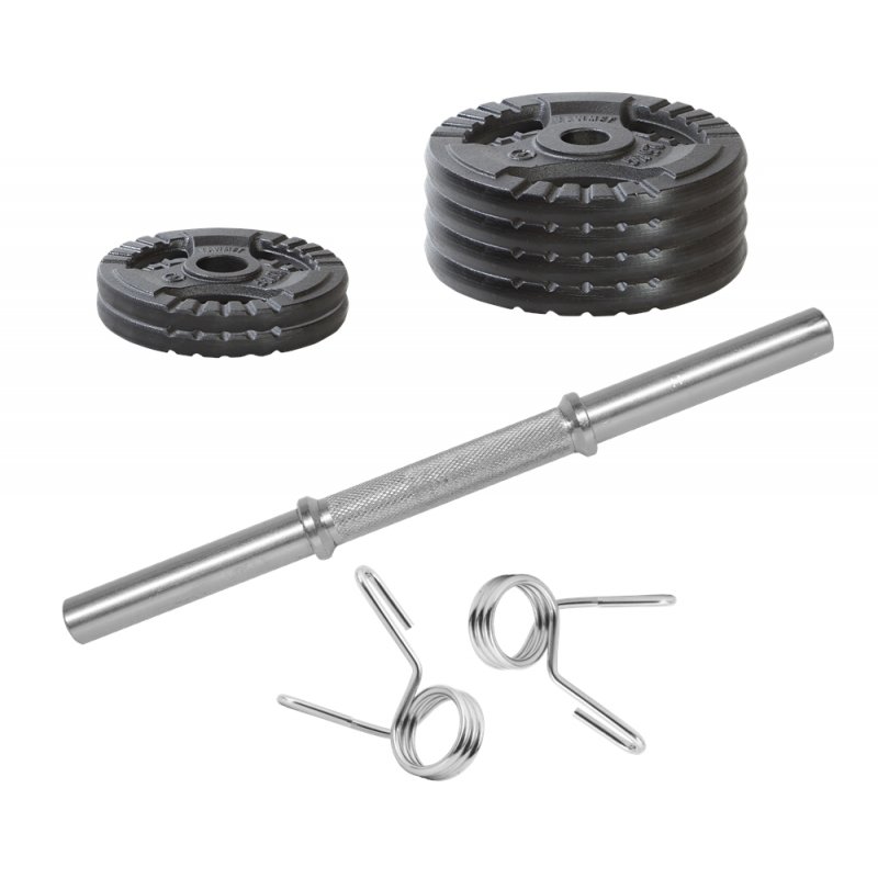 W skład zestawu wchodzą żeliwne talerze o odpowiednio dobranej masie, dzięki czemu wykonując ćwiczenia użytkownik ma możliwość dostosowania obciążenia do rodzaju treningu (rzeźba/masa) oraz możliwości psychofizycznych.