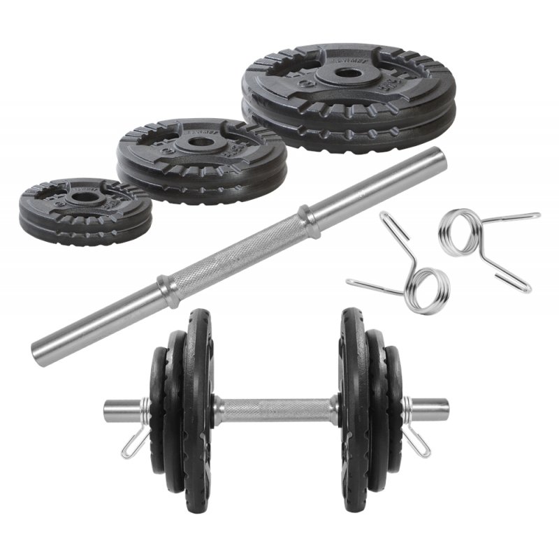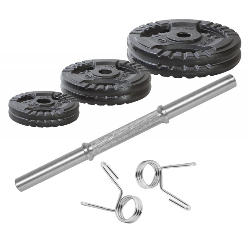 W skład zestawu wchodzą żeliwne talerze o odpowiednio dobranej masie, dzięki czemu wykonując ćwiczenia użytkownik ma możliwość dostosowania obciążenia do rodzaju treningu (rzeźba/masa) oraz możliwości psychofizycznych.