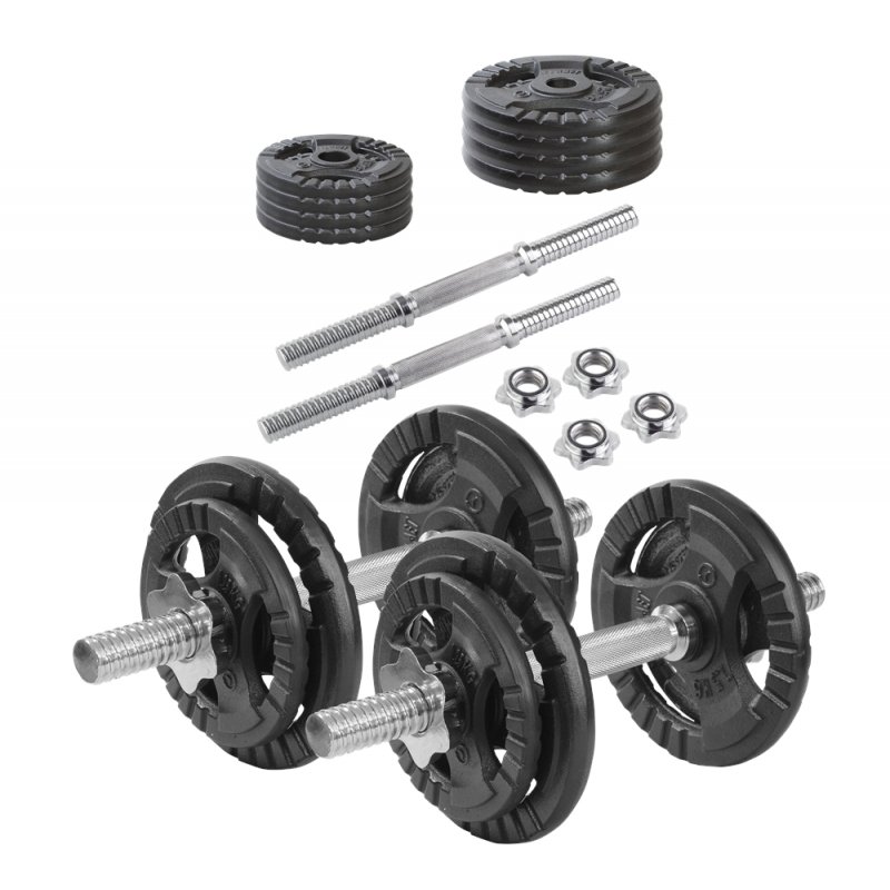 W skład zestawu wchodzą żeliwne talerze o odpowiednio dobranej masie, dzięki czemu wykonując ćwiczenia użytkownik ma możliwość dostosowania obciążenia do rodzaju treningu (rzeźba/masa) oraz możliwości psychofizycznych.