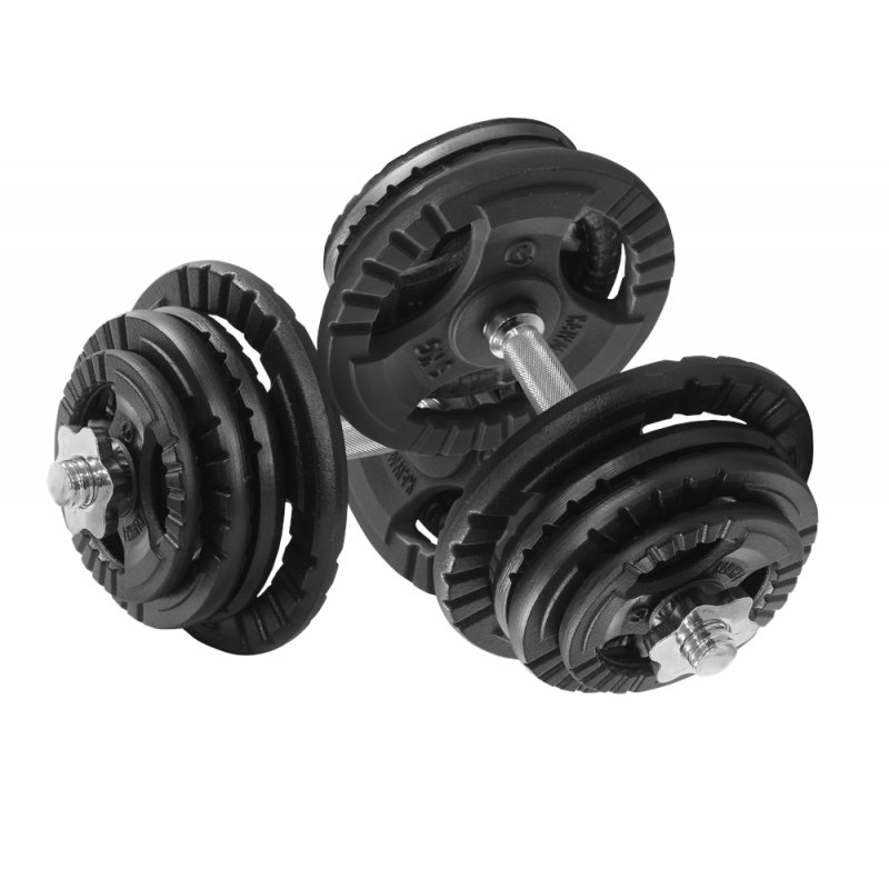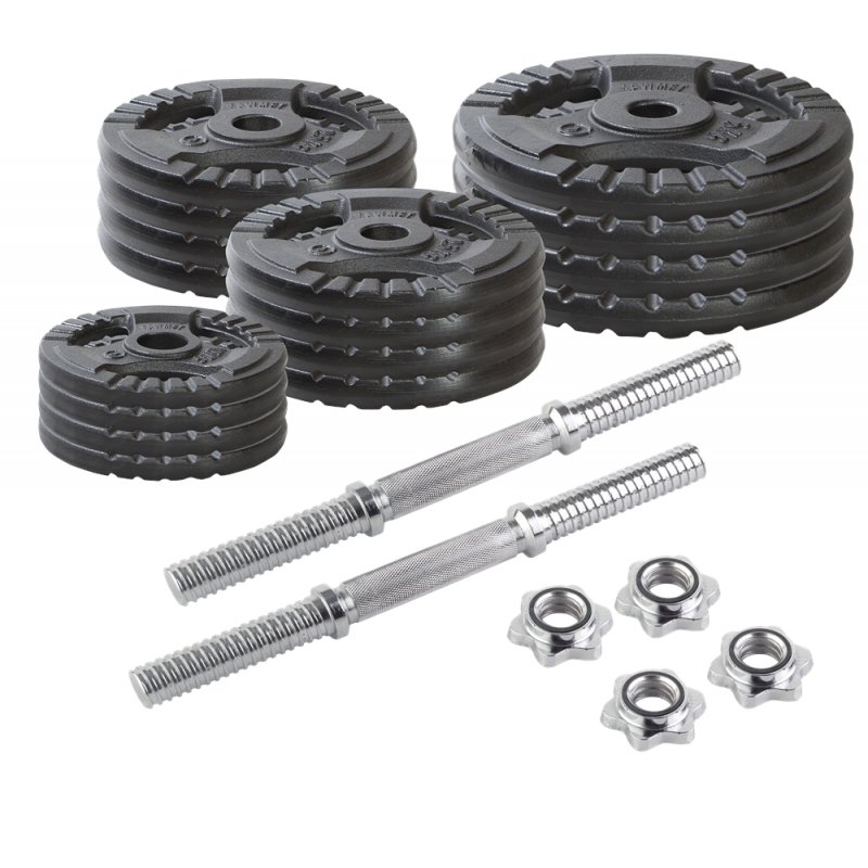 W skład zestawu wchodzą żeliwne talerze o odpowiednio dobranej masie, dzięki czemu wykonując ćwiczenia użytkownik ma możliwość dostosowania obciążenia do rodzaju treningu (rzeźba/masa) oraz możliwości psychofizycznych.