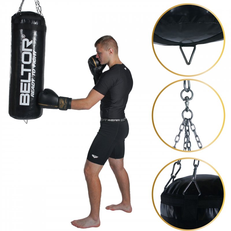 Worek sprzedawany jest wraz z wypełnieniem, dzięki czemu po zakupie od razu jest gotowy do użytkowana. Łańcuch mocowany za pomocą karabińczyków zapewnia możliwość regulacji wysokości worka dzięki czemu można unieść go jeszcze wyżej niżeli maksymalna długość łańcucha!