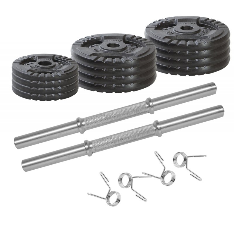W skład zestawu wchodzą żeliwne talerze o odpowiednio dobranej masie, dzięki czemu wykonując ćwiczenia użytkownik ma możliwość dostosowania obciążenia do rodzaju treningu (rzeźba/masa) oraz możliwości psychofizycznych.