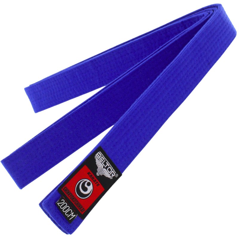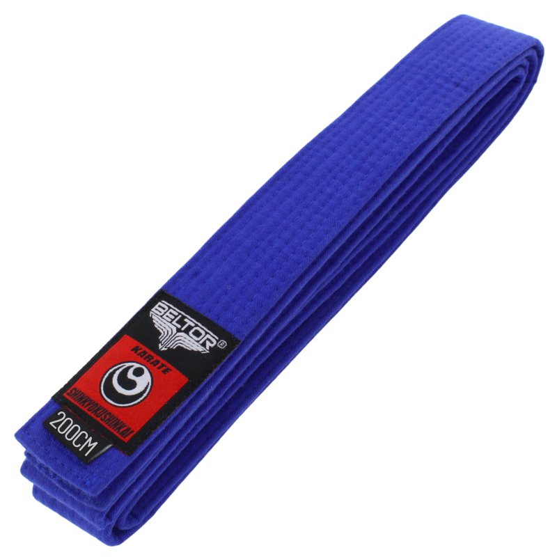 Jest to trzeci etap na drodze do doskonalenia umiejętności karate. Niebieski nawiązuje do drugiej czakry, która znajduję się w okolicach kości krzyżowej. Jej żywiołem jest Woda - symbol płynności oraz umiejętności przystosowania się. Posiadanie niebieskiego pasa oznacza naukę koordynacji technik, giętkości ciała oraz płynności ruchów. Jest to etap treningu panowania nas sobą, swoim umysłem i umiejętnością skrywania emocji. Pokorne doskonalenie swoich umiejętności pozwolą na uzyskanie pasa w kolorze żółtym.