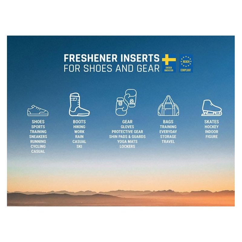 Szwedzka innowacja: opracowana, zaprojektowana i przetestowana w Szwecji. Zawiera zastrzeżoną mieszankę węgla bambusowego Moso i minerałów, które osuszają i dezodoryzują, zatrzymując wilgoć, zapach, zanieczyszczenia i bakterie. Nasycony świeżym zapachem. Neutralny dla klimatu, posiadający certyfikat REACH dotyczący bezpieczeństwa i ochrony środowiska oraz w 100% nietoksyczny.